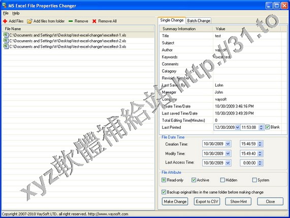 VaySoft MS Excel File Properties Changer v3.16 英文正式版(文檔屬性修改軟體)